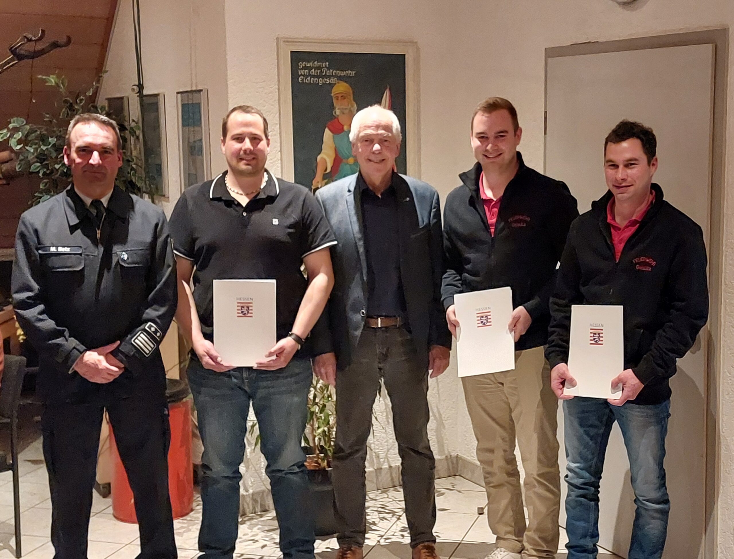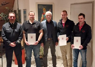 Zum Abschluss der Versammlung erhielten Lukas und Nico Kummer eine Anerkennungsprämie des Landes Hessen für zehn Jahre aktive Tätigkeit in der Einsatzabteilung, Manuel Oppermann sogar für 20 Jahre. Darüber hinaus wurde Nico Kummer zum Oberlöschmeister befördert. Für 25 Jahre Vereinsmitgliedschaft wurde Ludwig Landschreiber geehrt und für 50 Jahre Vereinsmitgliedschaft Alexander Orlow, Wolfgang Busch sowie Holger Weber.